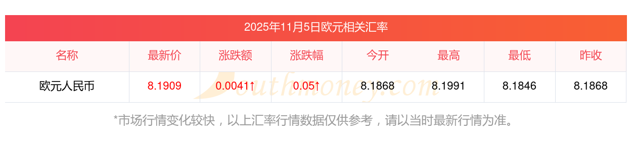 根據2025年11月5日匯率,歐元兌換人民幣匯率最新價8.190900,今開價8.1868,昨收價8.1868,最高價8.1991,最低價8.1846。