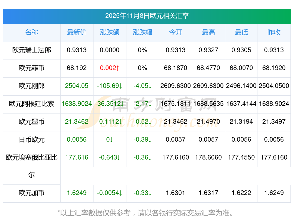 根據(jù)2025年11月8日匯率,歐元兌換菲幣匯率最新價68.192000,今開價68.1870,昨收價68.1920,最高價68.4770,最低價68.0070。