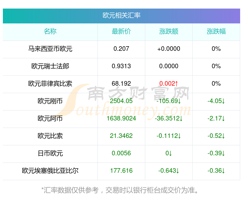 南方財(cái)富網(wǎng)為您提供歐元對(duì)泰國(guó)幣匯率最新價(jià)格詳情。