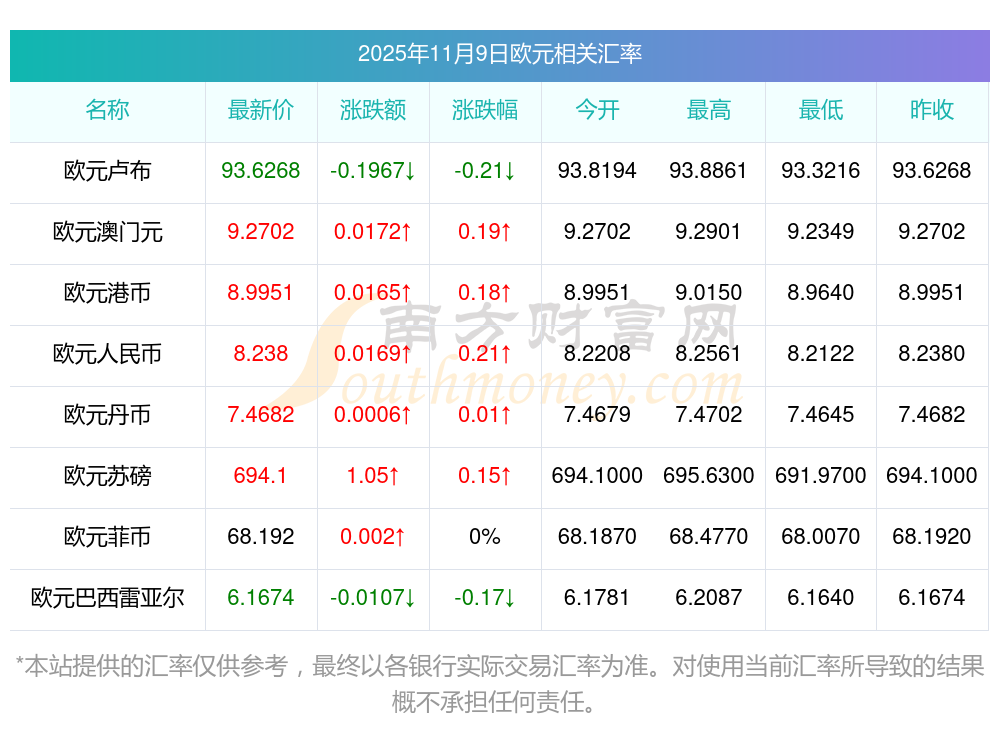 根據(jù)2025年11月9日匯率計算,歐元兌換剛幣匯率最新價2504.050000,今開價2609.6300,昨收價2504.0500,最高價2609.6300,最低價2496.1400。