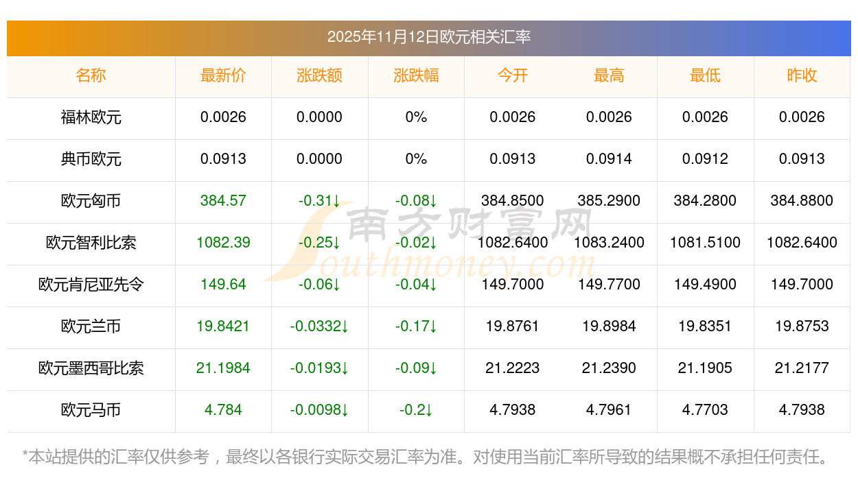 2025年11月12日歐元相關(guān)匯率查詢