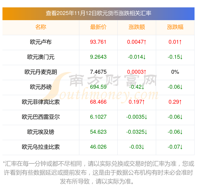 根據(jù)2025年11月12日匯率,歐元兌換牙買加元匯率最新186.193900,今開185.5322,昨收185.5322,最高186.3547,最低185.5322。
