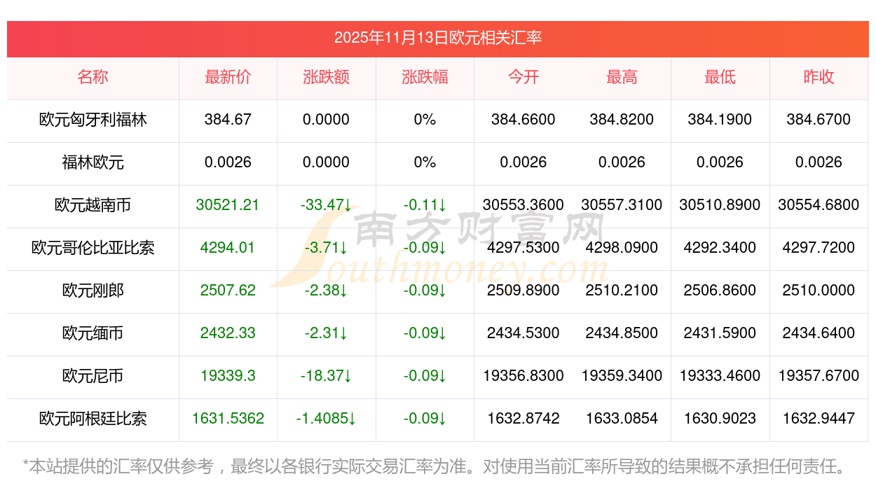 2025年11月13日歐元相關(guān)匯率查詢