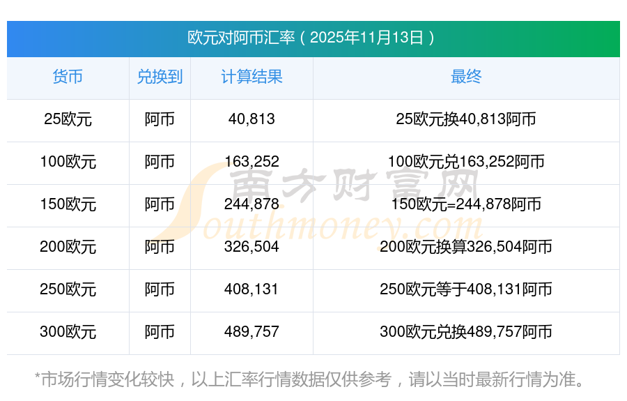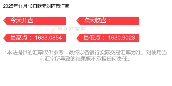 今日歐元匯價(jià):2025年11月13日13歐元兌阿幣匯價(jià)一覽表