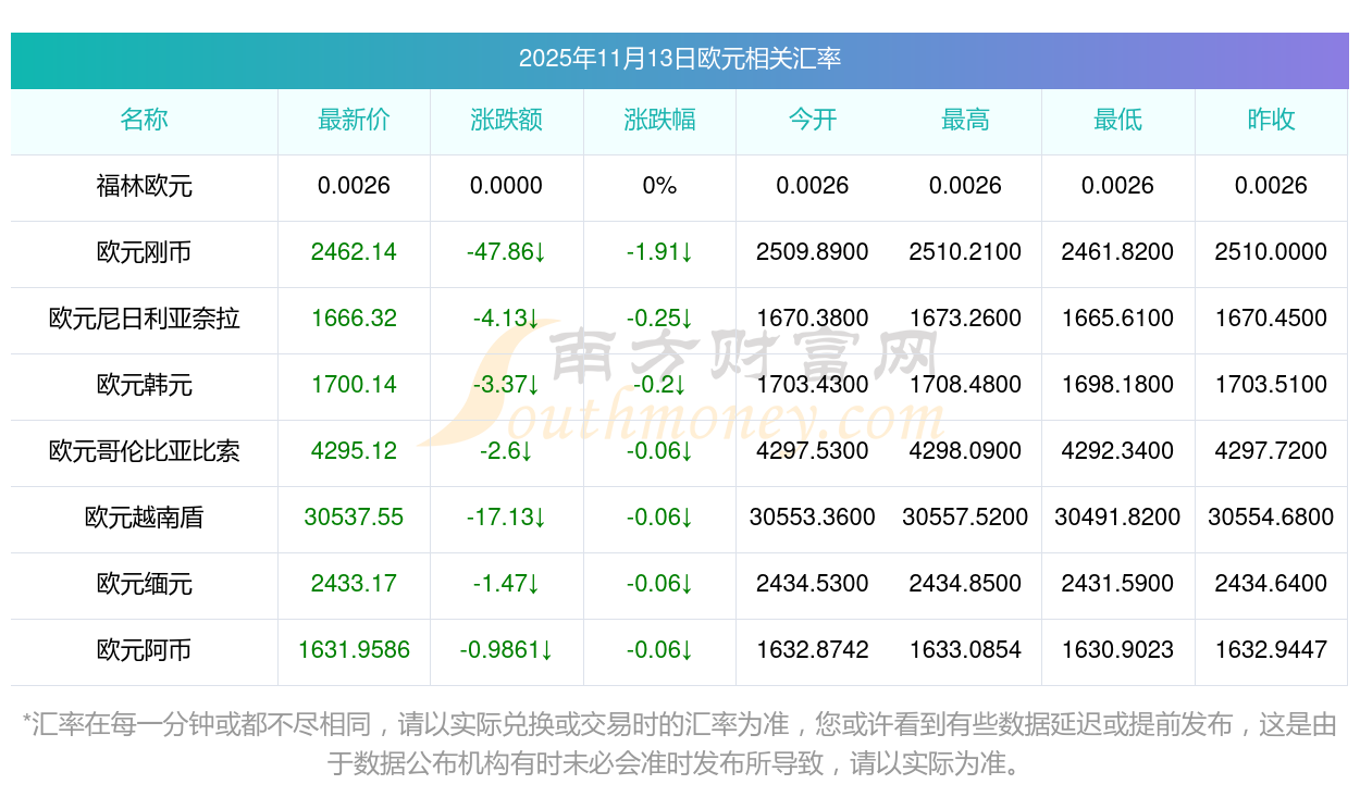 2025年11月13日歐元相關(guān)匯率查詢