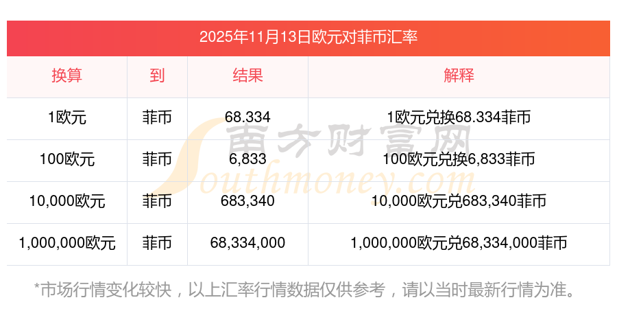 2025年11月13日歐元兌換菲幣匯率是:68.334