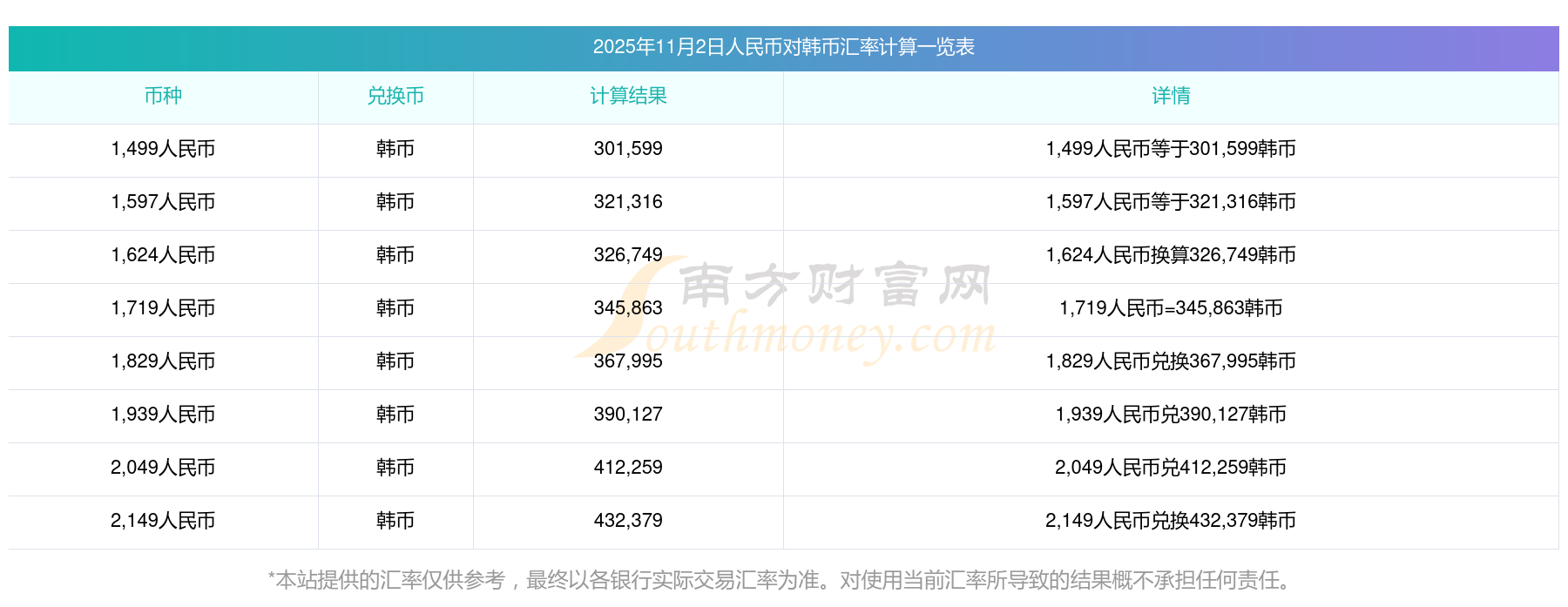 今日韓元匯率中間價:人民幣對多少韓元2025年11月2日