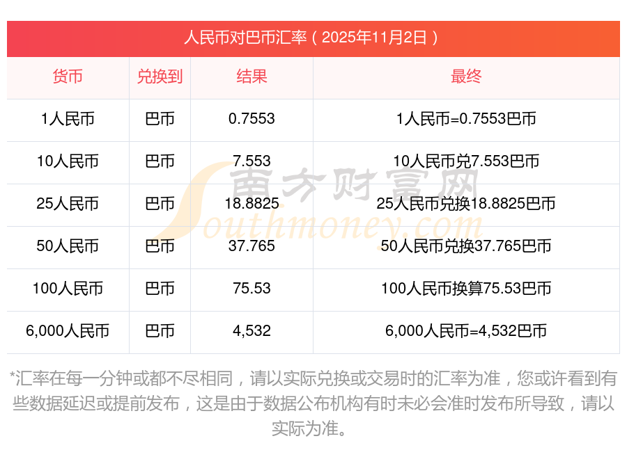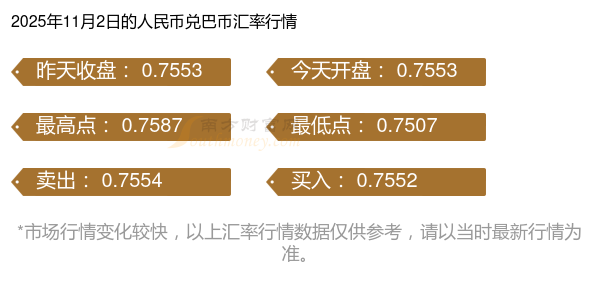 今日人民幣匯價:2025年11月2日16人民幣兌巴幣匯價一覽表