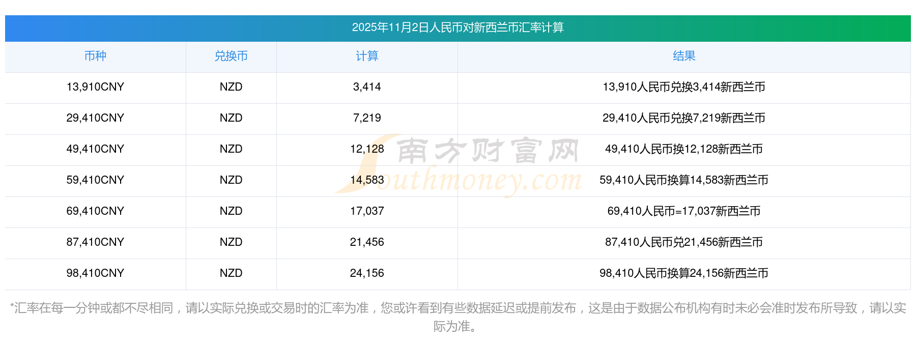 人民幣匯率,2025年11月2日人民幣對新西蘭幣匯率查詢