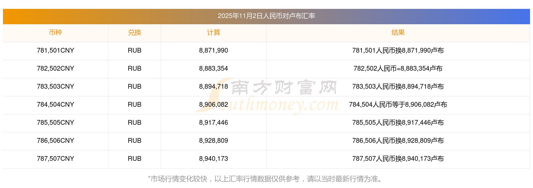 今日匯價查詢:2025年11月2日41人民幣兌盧布匯價一覽