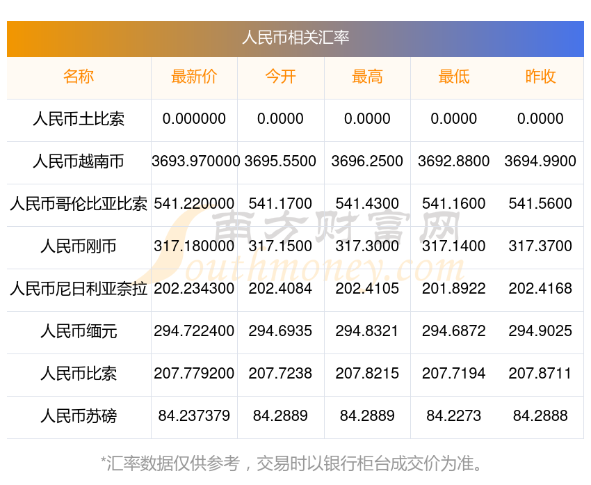 匯率在每一分鐘或都不盡相同,請以實際兌換或交易時的匯率為準,您或許看到有些數(shù)據(jù)延遲或提前發(fā)布,這是由于數(shù)據(jù)公布機構有時未必會準時發(fā)布所導致,請以實際為準。