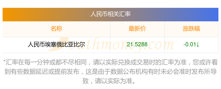 外匯匯率調(diào)整 人民幣對(duì)埃塞俄比亞比爾匯率計(jì)算表2025/11/5