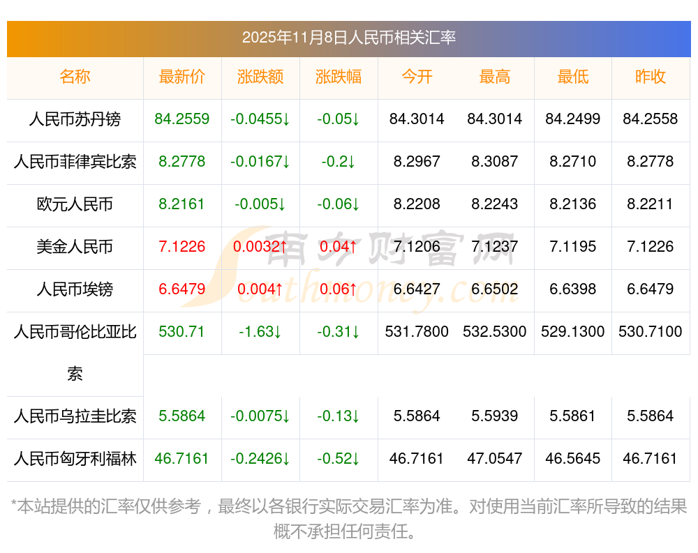 2025年11月8日最新消息,人民幣兌換澳門幣最新匯率為1.125300,今開為1.1253,昨收為1.1252,最高為1.1259,最低為1.1242。