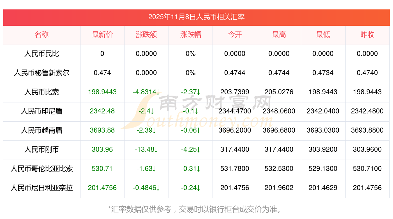 根據(jù)2025年11月8日匯率,人民幣兌換盧布匯率最新11.365300,今開11.4106,昨收11.3653,最高11.4291,最低11.3599。