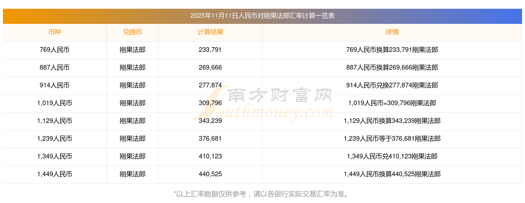 今天匯率更新!2025年11月11日43人民幣兌換剛果法郎是多少?