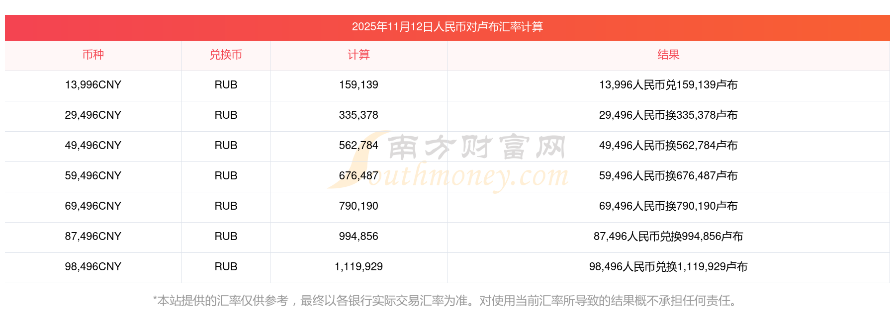 盧布匯率中間價:人民幣1元對多少俄羅斯盧布2025/11/12