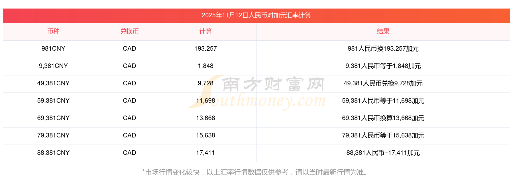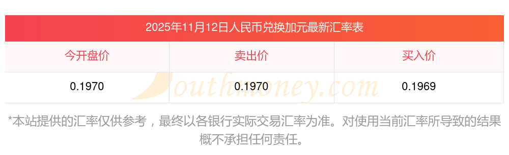 匯價(jià)查詢:2025年11月12日人民幣兌加元匯價(jià)一覽