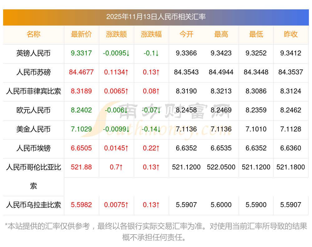 2025年11月13日最新消息,人民幣兌換英鎊最新匯率為0.107310,今開(kāi)為0.1071,昨收為0.1071,最高為0.1074,最低為0.1070。