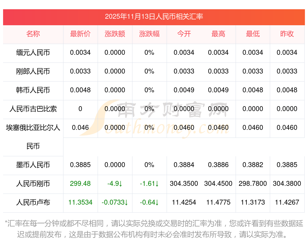 2025年11月13日最新消息,人民幣兌換蘇磅最新匯率為84.543253,今開(kāi)為84.3543,昨收為84.3537,最高為84.5707,最低為84.3448。