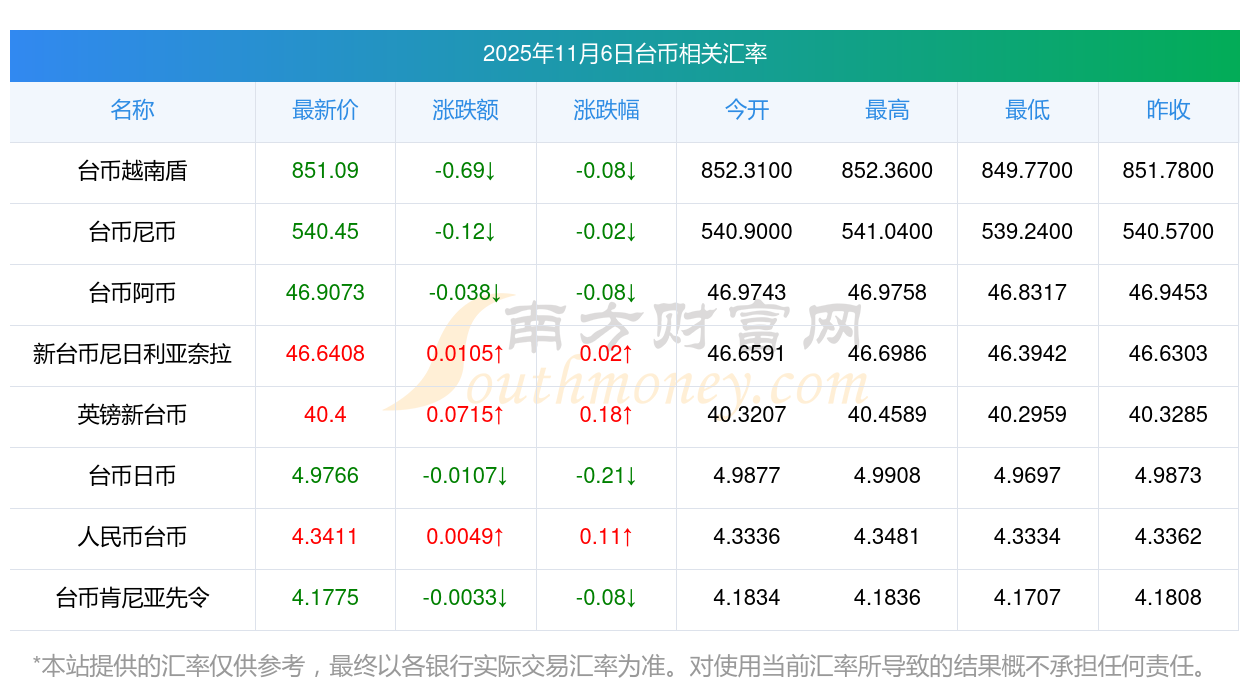 2025年11月6日臺(tái)幣相關(guān)匯率查詢