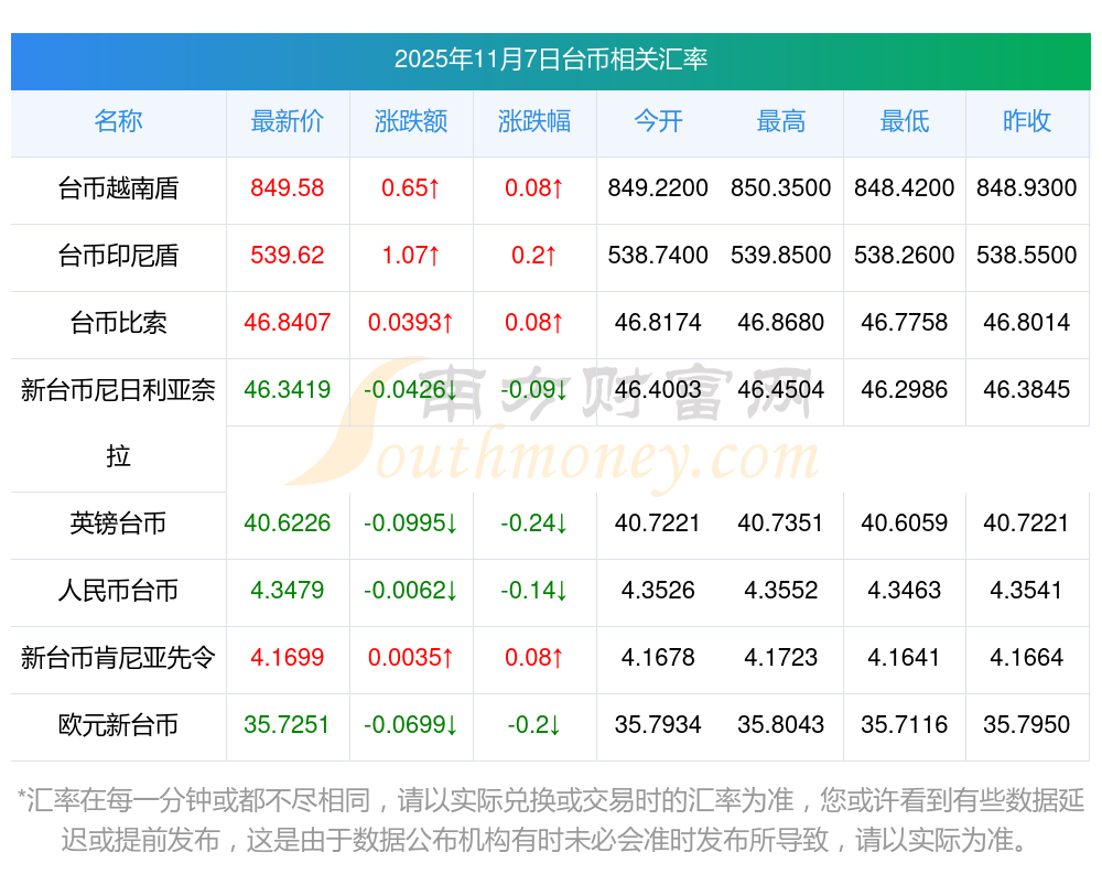 2025年11月7日臺幣相關(guān)匯率查詢