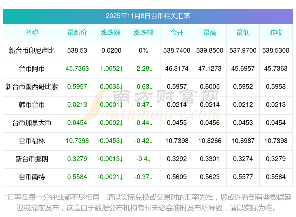 根據(jù)2025年11月8日匯率,臺幣兌換摩洛哥迪拉姆匯率最新價0.298900,今開價0.2991,昨收價0.2991,最高價0.3001,最低價0.2987。