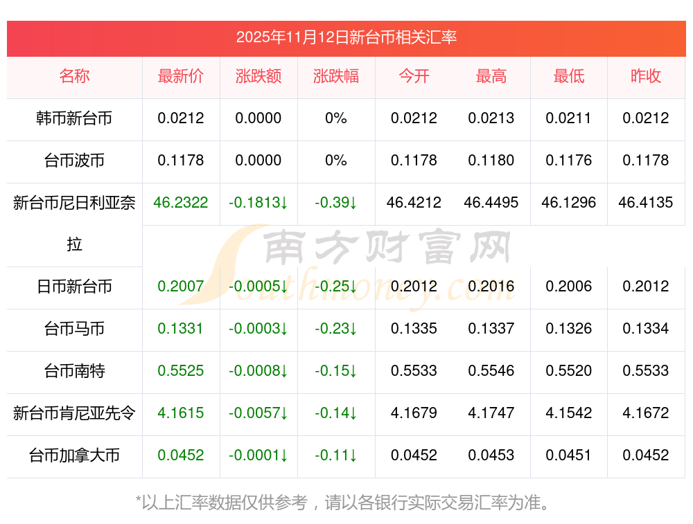 2025年11月12日新臺(tái)幣相關(guān)匯率查詢