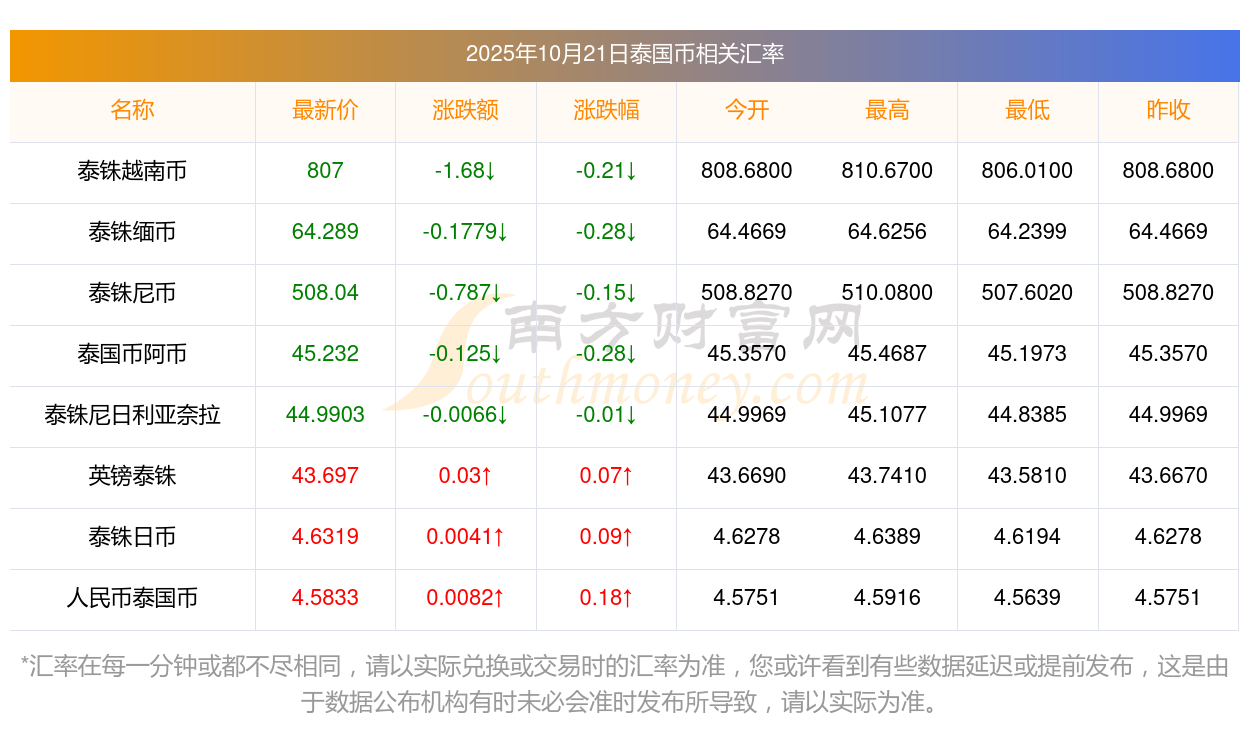 2025年10月21日最新消息,泰國幣兌換捷克克朗最新匯率為0.639985,今開為0.6406,昨收為0.6406,最高為0.6419,最低為0.6392。