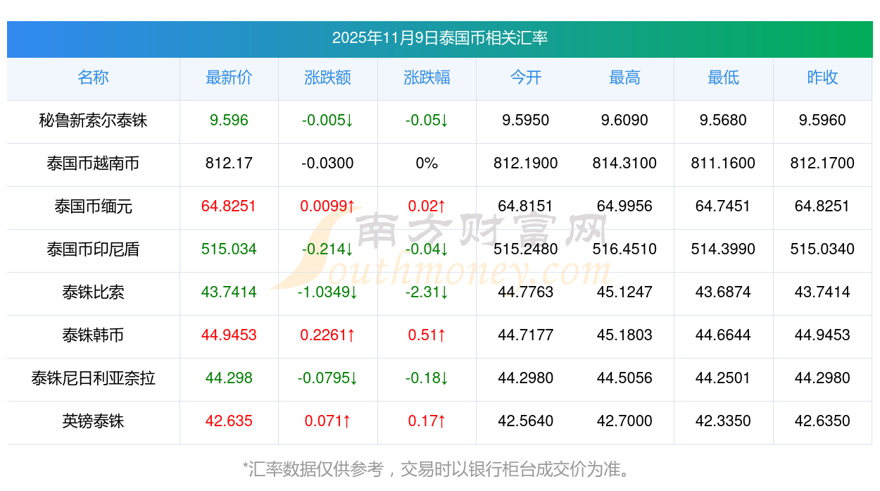 2025年11月9日泰國(guó)幣相關(guān)匯率查詢