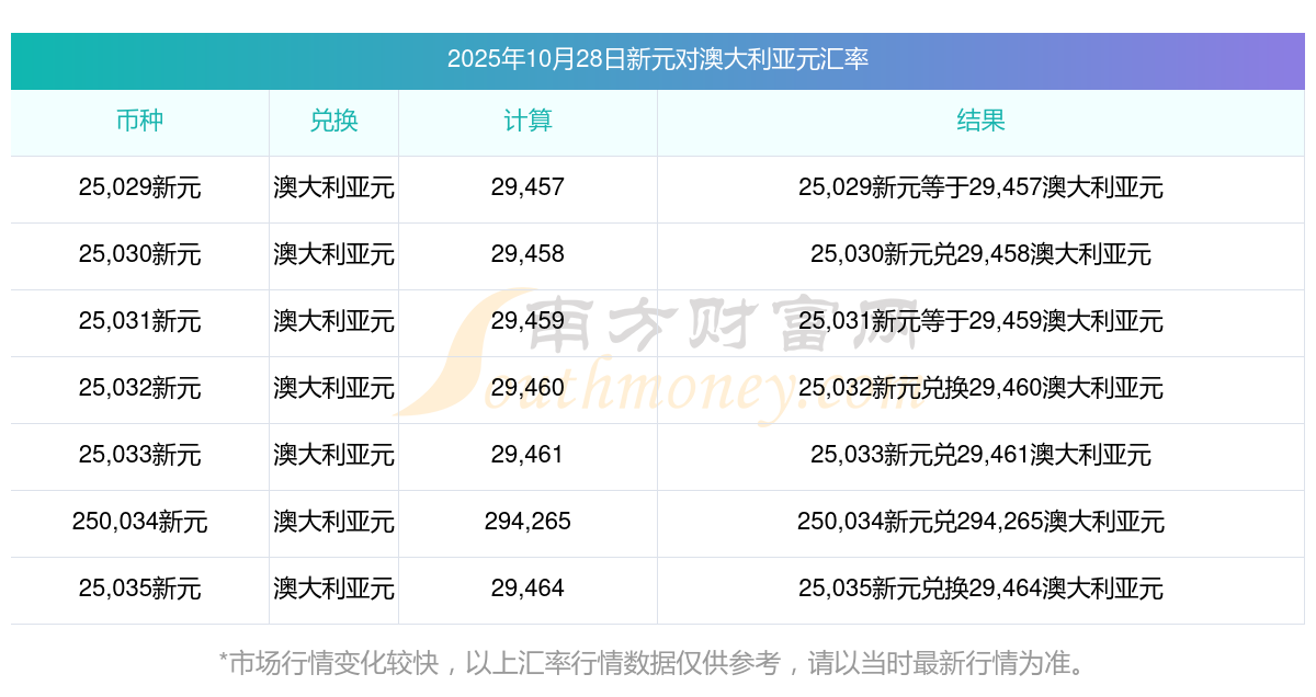 新元兌換澳大利亞元匯率行情(2025年10月28日)
