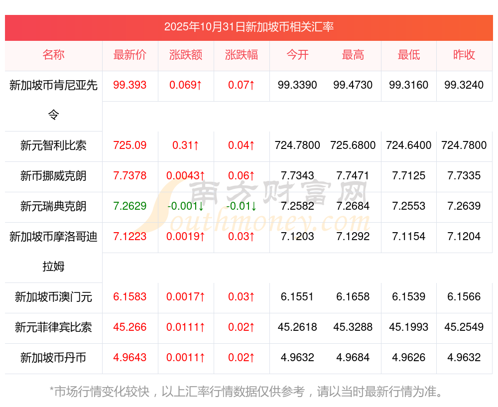2025年10月31日新加坡幣相關(guān)匯率查詢