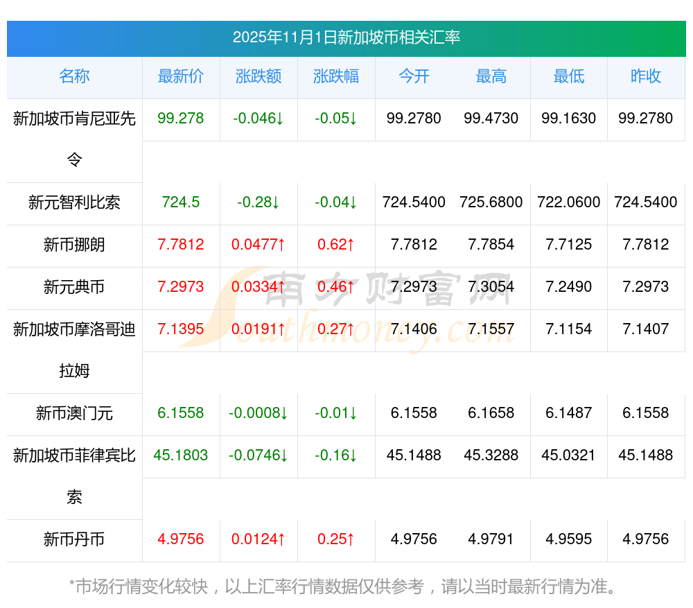 2025年11月1日新加坡幣相關(guān)匯率查詢