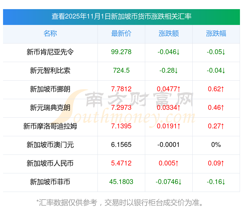 2025年11月1日新加坡幣相關(guān)匯率查詢(xún)