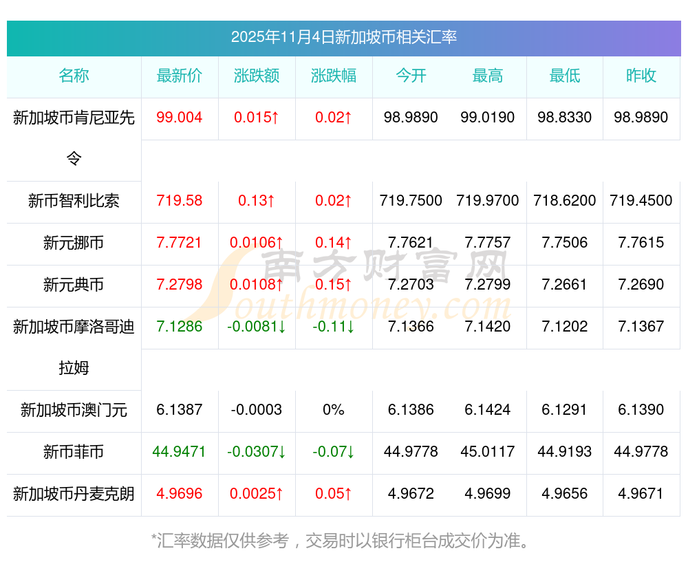 2025年11月4日新加坡幣相關(guān)匯率查詢