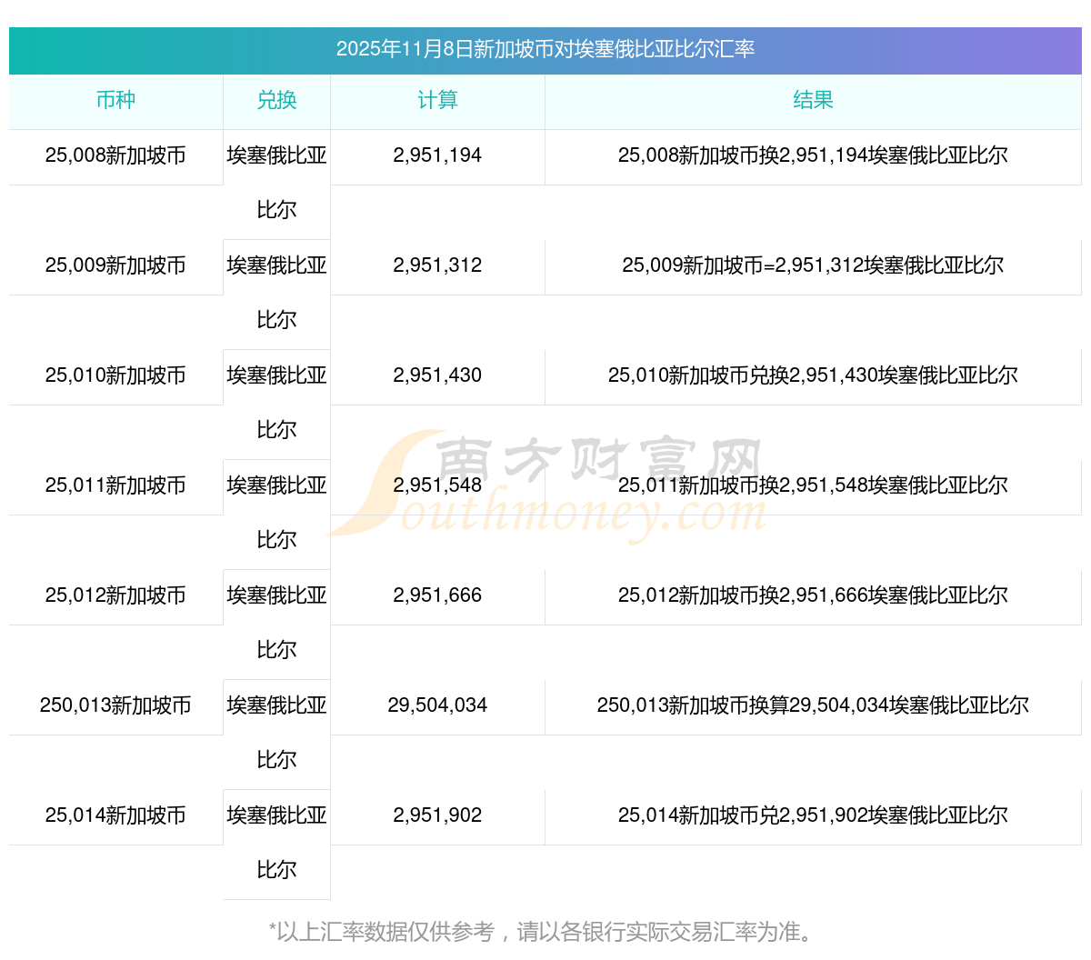 匯率新調(diào)整 14新加坡幣兌換埃塞俄比亞比爾匯率行情? 2025年11月8日