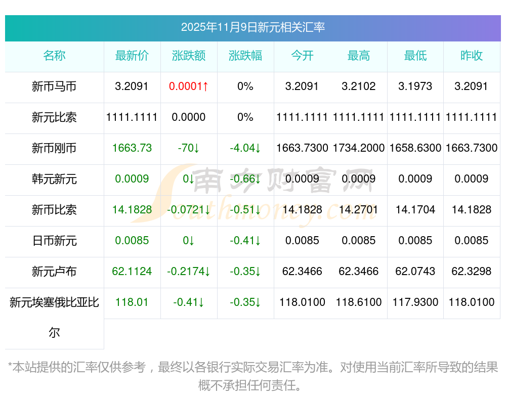 根據(jù)2025年11月9日匯率,新元兌換比索匯率最新價1111.111111,今開價1111.1111,昨收價1111.1111,最高價1111.1111,最低價1111.1111。