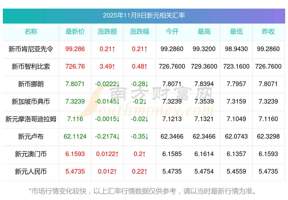 根據(jù)2025年11月9日匯率,新元兌換秘魯新索爾匯率最新價2.594400,今開價2.5944,昨收價2.5944,最高價2.5958,最低價2.5872。