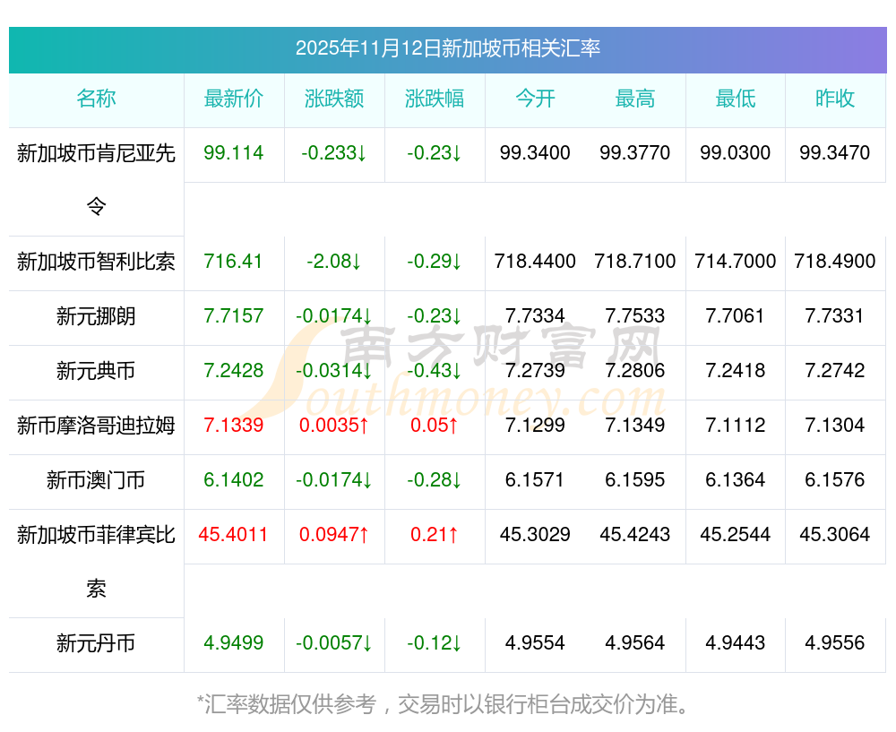 2025年11月12日新加坡幣相關(guān)匯率查詢