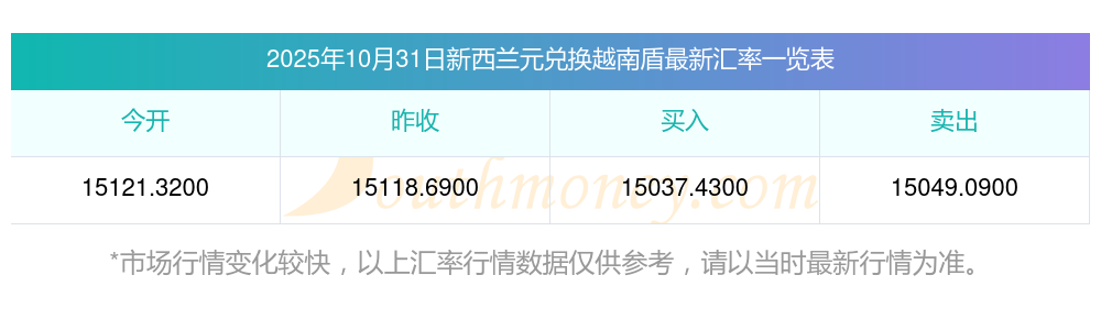 新西蘭元匯率今日價(jià)格:2025年10月31日新西蘭元兌換越南盾價(jià)格一覽表