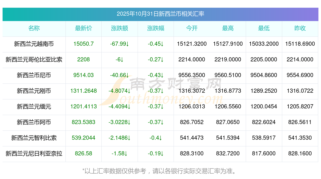 2025年10月31日新西蘭幣相關(guān)匯率查詢