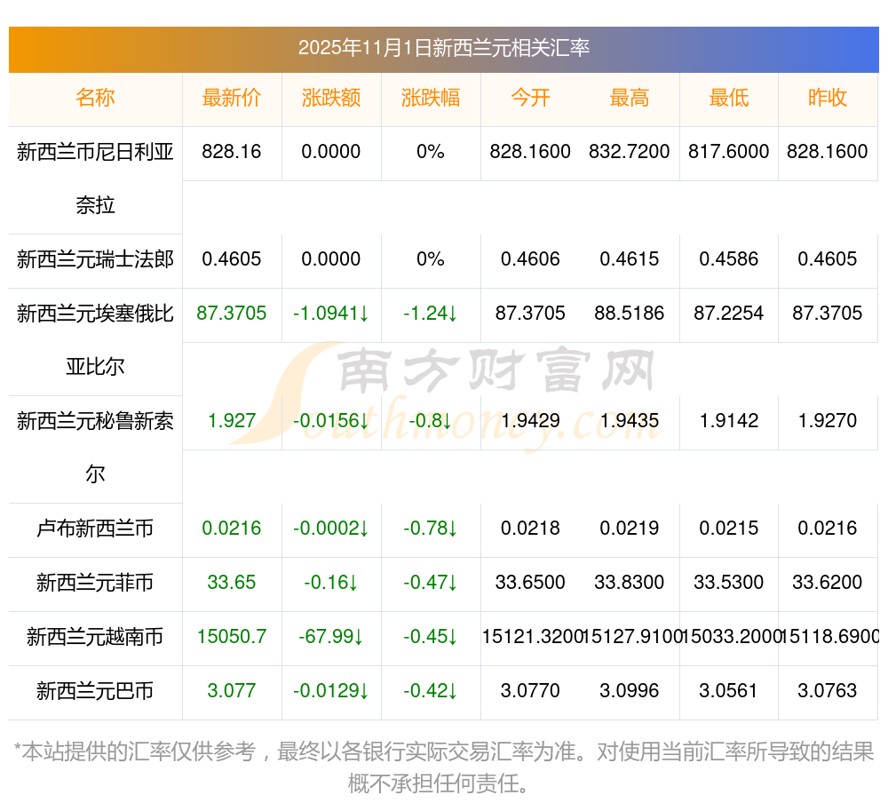 2025年11月1日新西蘭元相關(guān)匯率查詢