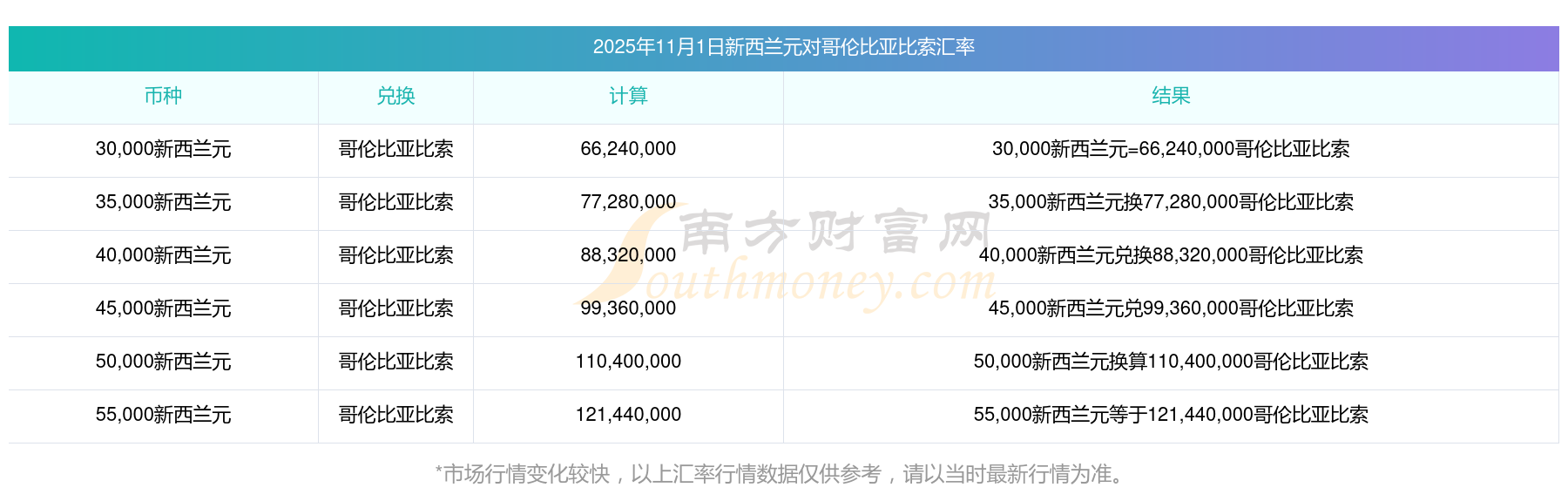 今天匯率計算:52新西蘭元兌換多少哥倫比亞比索的?(2025年11月1日)
