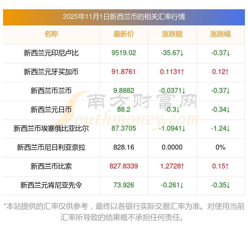 2025年11月1日新西蘭幣相關(guān)匯率查詢