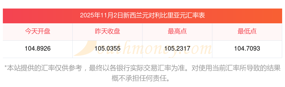 最新2025年11月2日新西蘭元兌換利比里亞元匯率是:105.0355