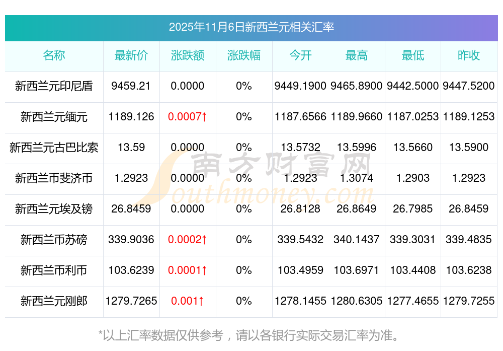 2025年11月6日新西蘭元相關(guān)匯率查詢