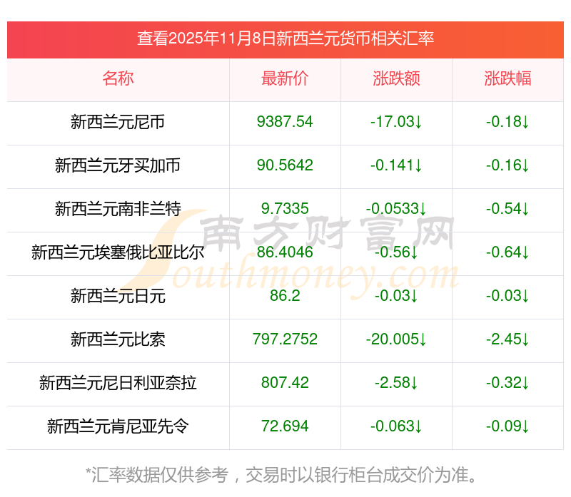 2025年11月8日新西蘭元相關(guān)匯率查詢
