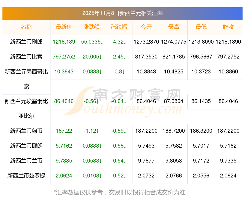 2025年11月8日新西蘭元相關匯率查詢