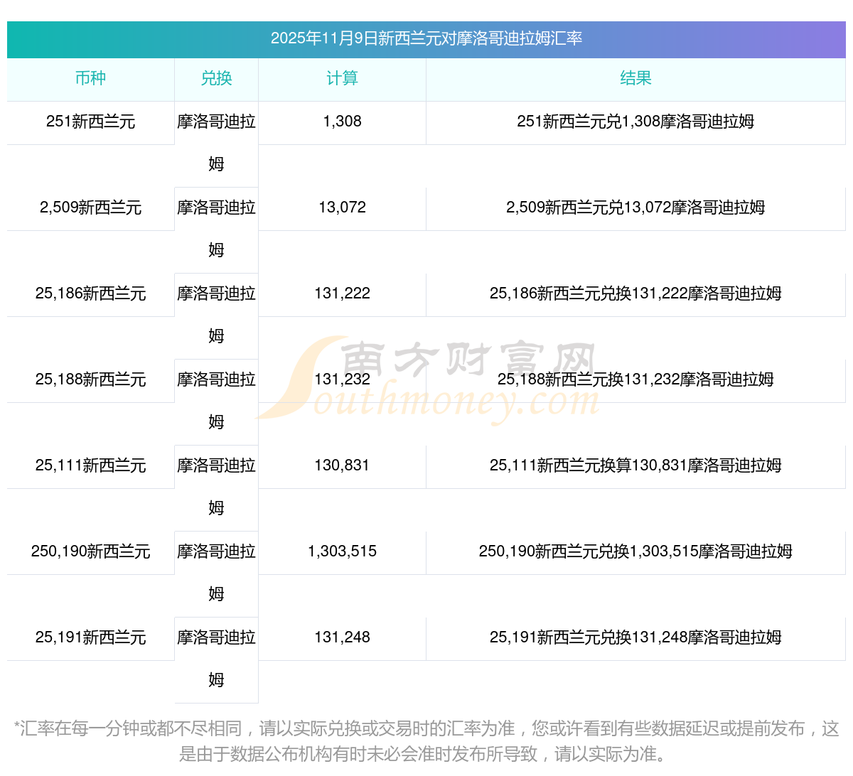 南方財富網(wǎng)為您提供新西蘭元換成摩洛哥迪拉姆匯率最新價格詳情。