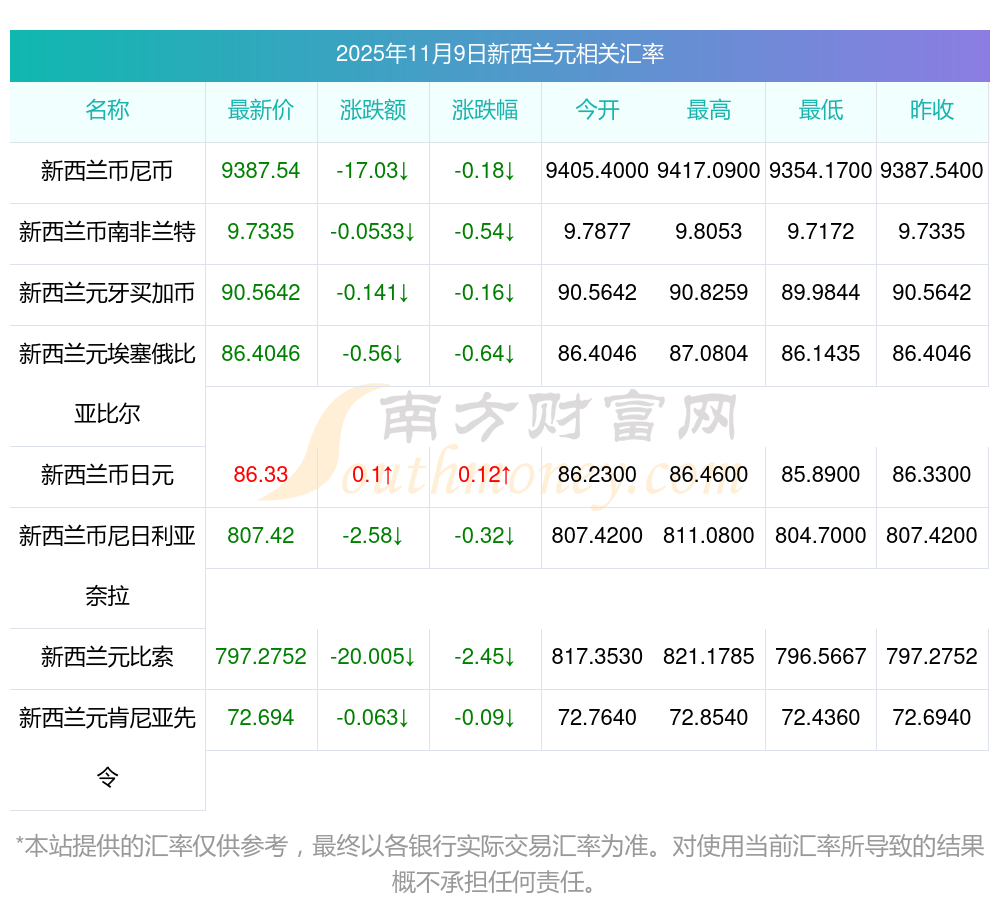 2025年11月9日新西蘭元相關(guān)匯率查詢