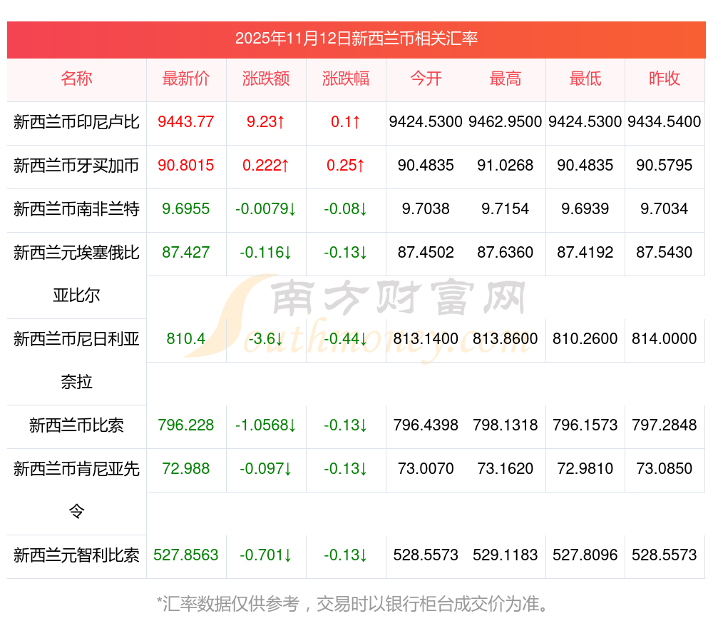 2025年11月12日新西蘭幣相關(guān)匯率查詢
